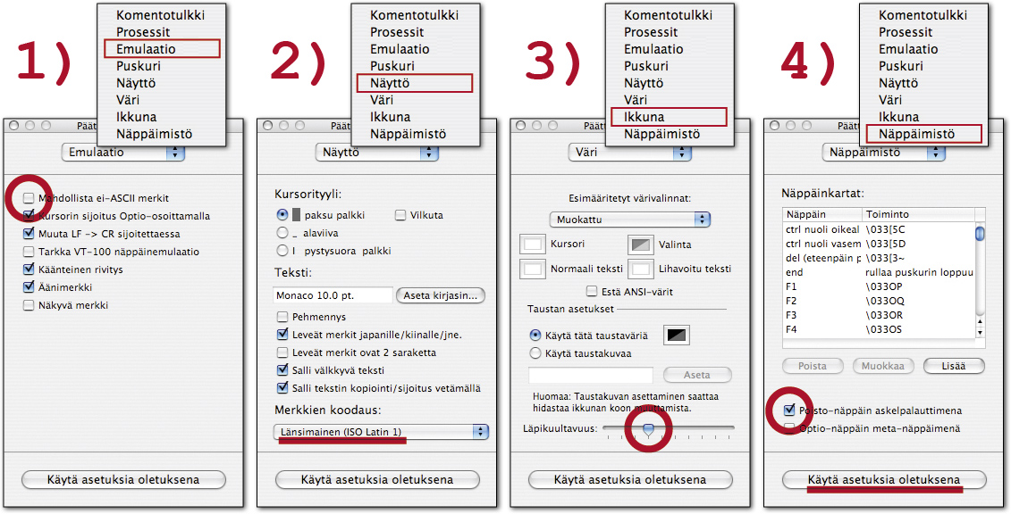 Mac OS X:ssä on valmiina pääteohjelma, jolla voi ottaa shh-yhteyden unix-koneeseen. Ohjelman sijainti: Ohjelmat > Lisäohjelmat > Pääte (Applications > Utilities > Terminal). Ohjelman asetuksia pitää ja kannattaa muuttaa ennnen käyttöä. Asetukset ovat valikossa: Pääte > Ikkunan asetukset... (Terminal > Window Settings...). Seuraavat ohjeet ovat vain suomeksi. Kuviin merkityt kohdat ovat kuitenkin samalla paikalla englanninkielisessä versiossa.