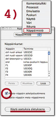 Näppäimistö-välilehdellä kannattaa vielä valita kohta "Poisto-näppäin askelpalauttimena", muuten backspace-näppäin toimii joissakin sovelluksissa - kuten Pinessä - deleten tapaan.